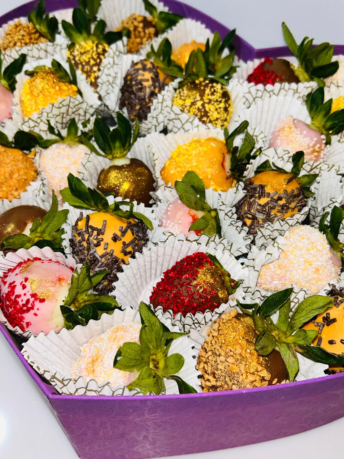 Ingrediente: căpșuni, ciocolată cu lapte, fulgi de cocos, zmeura si portocala liofilizata,alune caramelizate .
