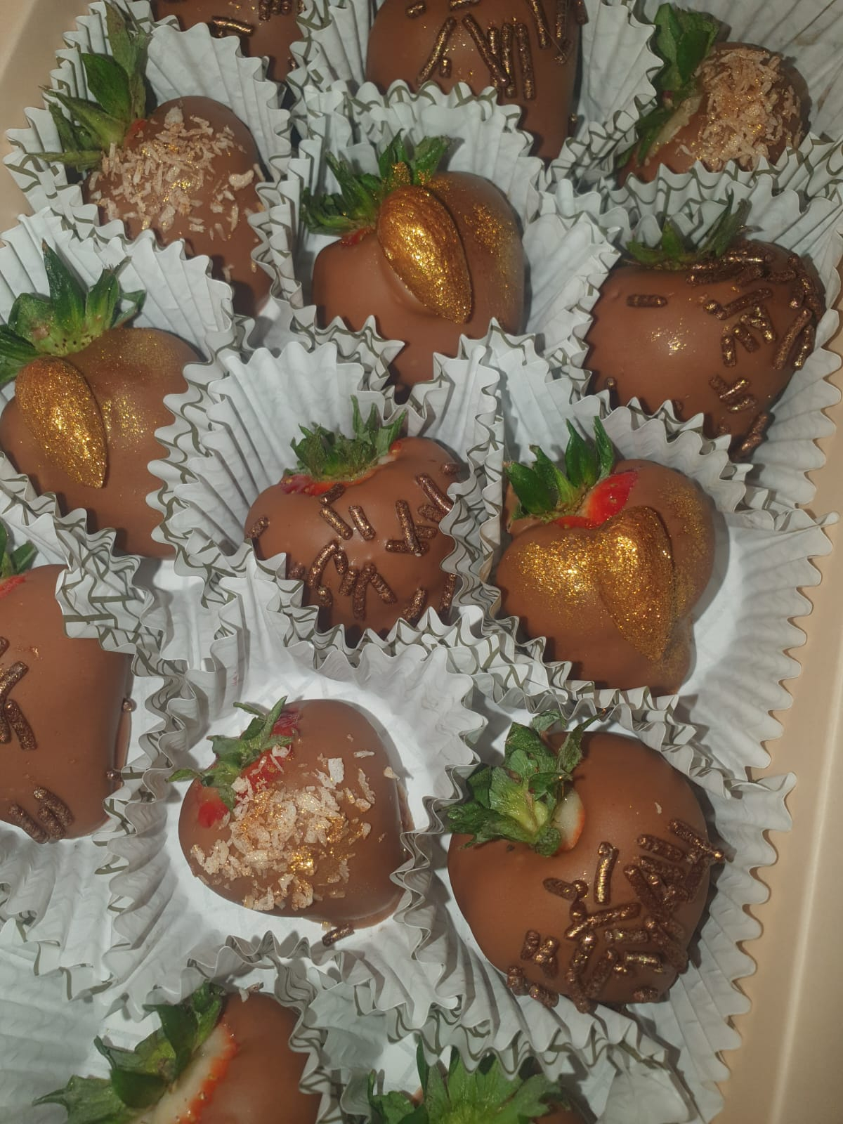 Ingrediente: căpșuni, ciocolată cu lapte, fulgi din nucă de cocos, migdale, biluțe de ciocolată crocantă, pulbere aurie comestibilă.