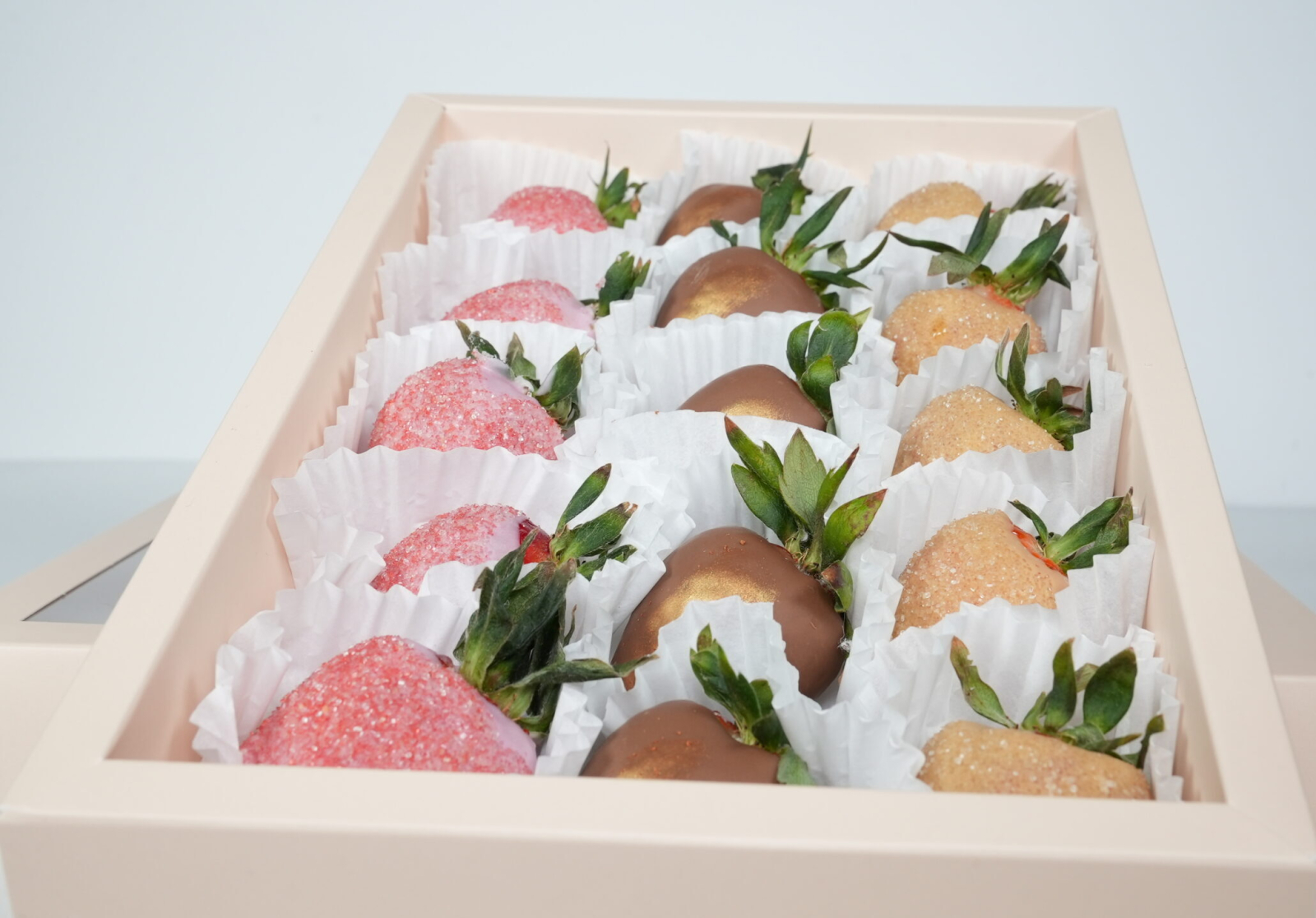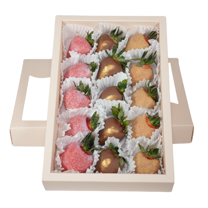 Ingrediente: căpșuni, ciocolată cu lapte, ciocolată Ruby, ciocolată roz, cristale de zahăr.