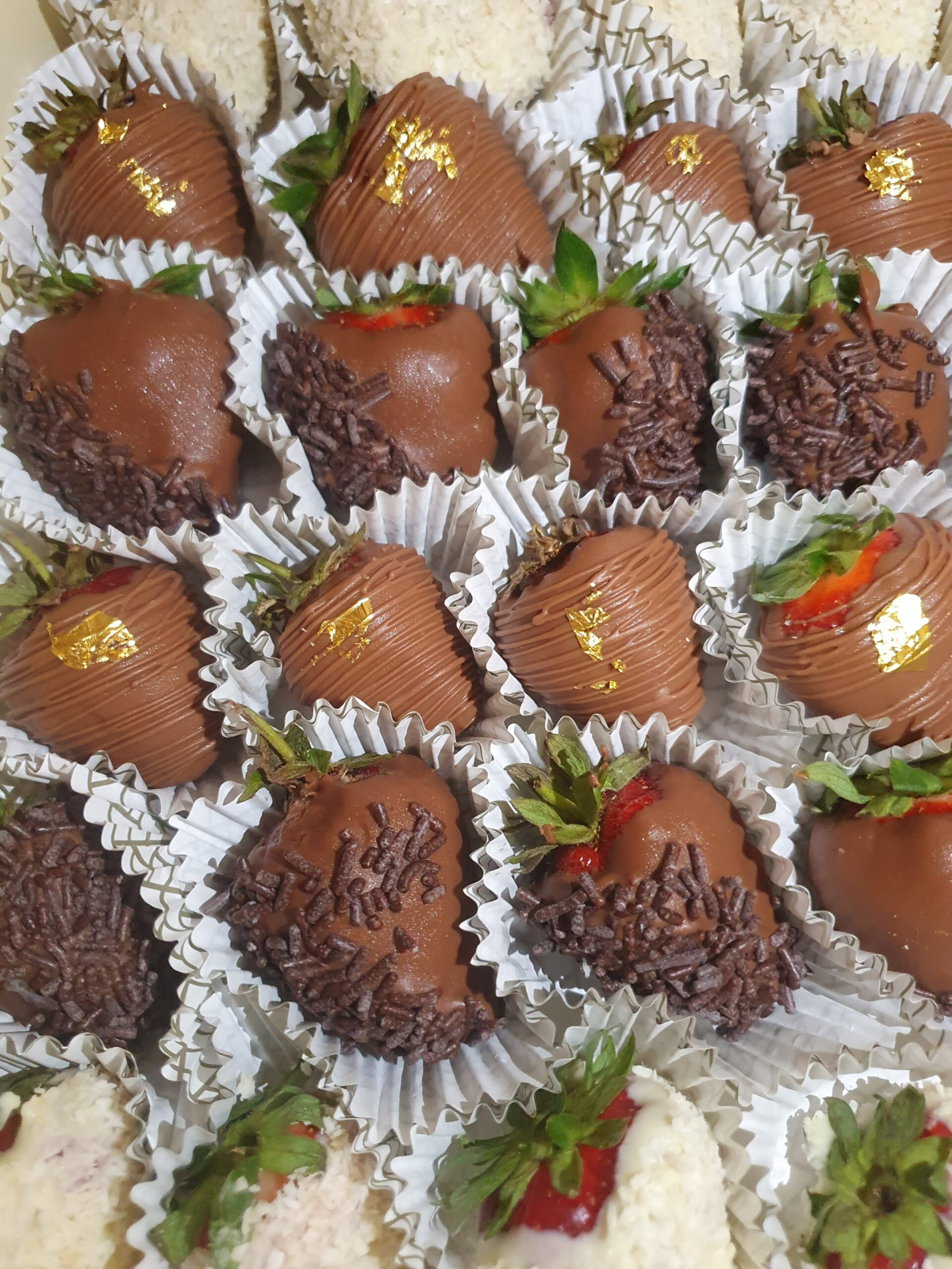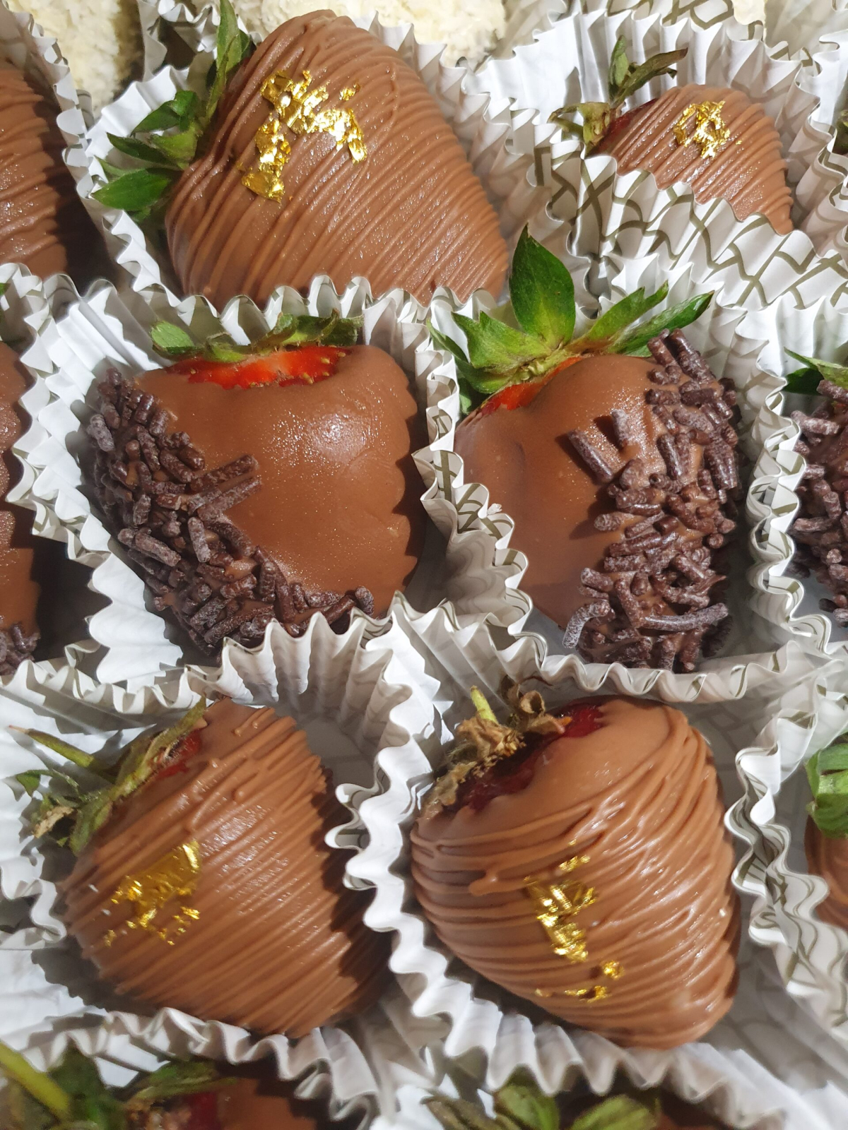Ingrediente: căpșuni organice, ciocolată albă, ciocolată cu lapte, bețișoare de ciocolată neagră, fulgi din nucă de cocos, pulbere de aur comestibil, foiță de aur comestibil.