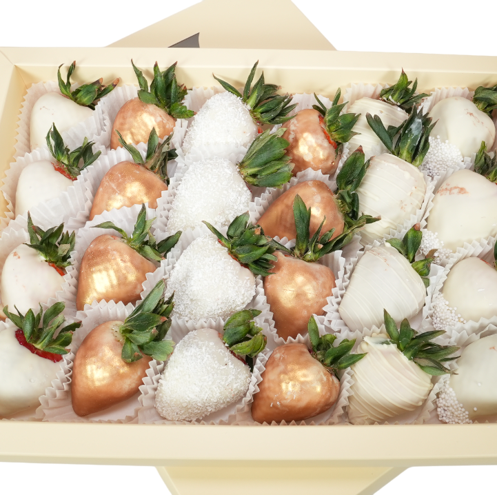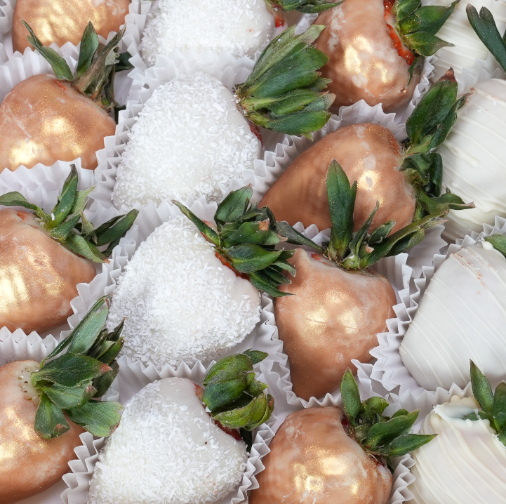 Ingrediente: căpșuni, ciocolată albă, nucă de cocos, perluțe de zahăr, pudră de aur.