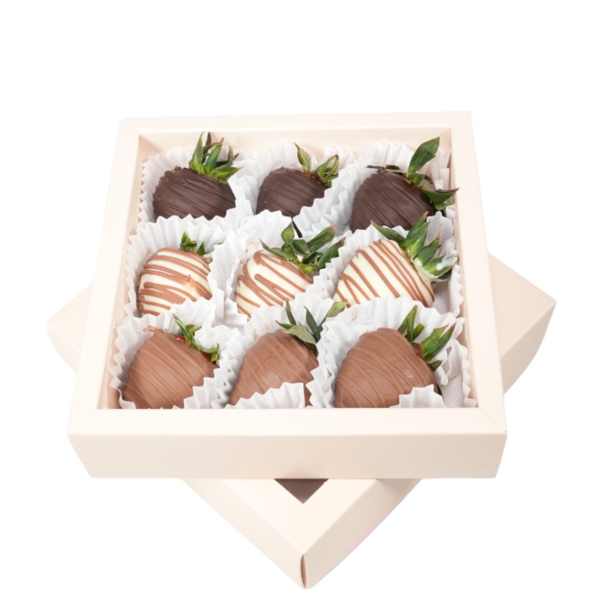 Ingrediente: căpșuni, ciocolată albă, ciocolată cu lapte, ciocolată neagră (70,5% unt de cacao).