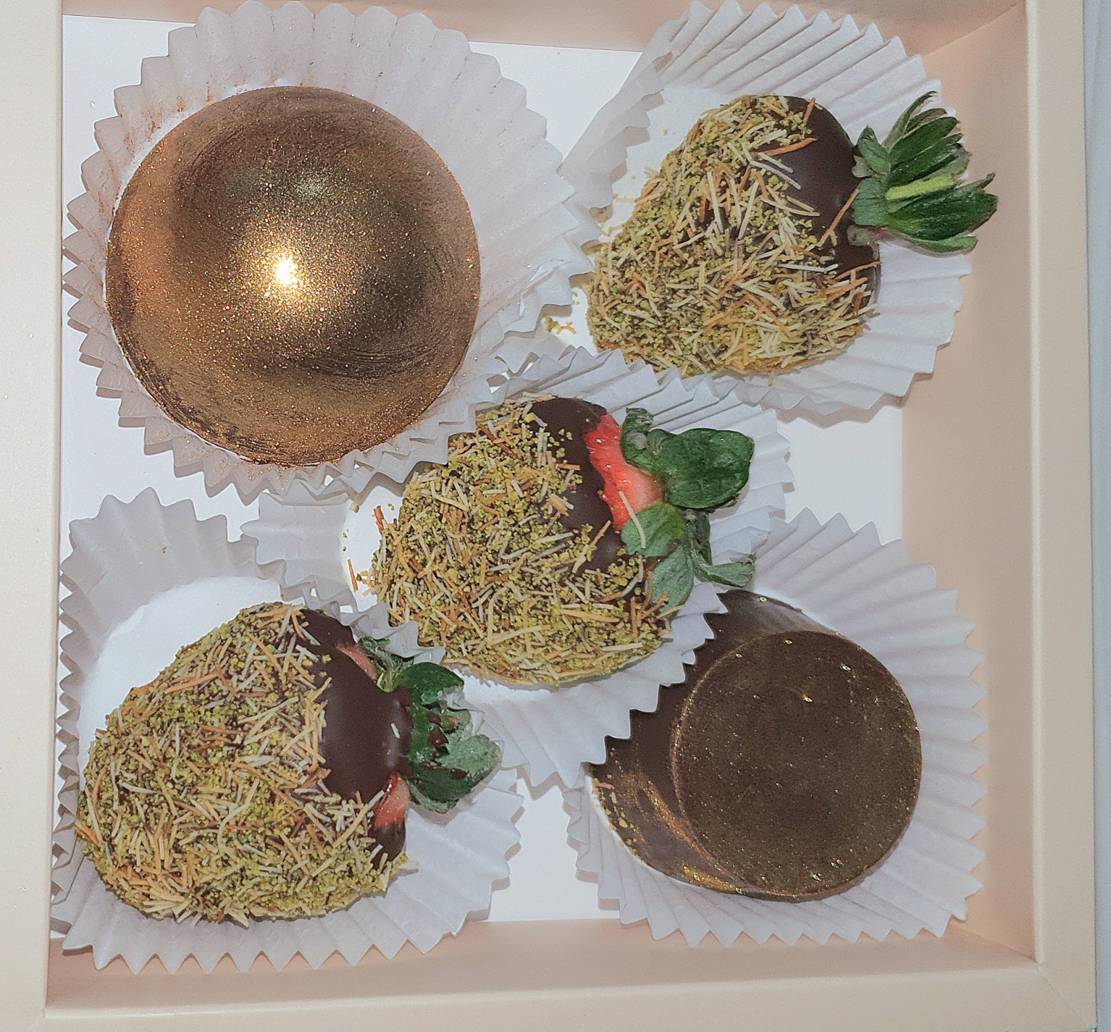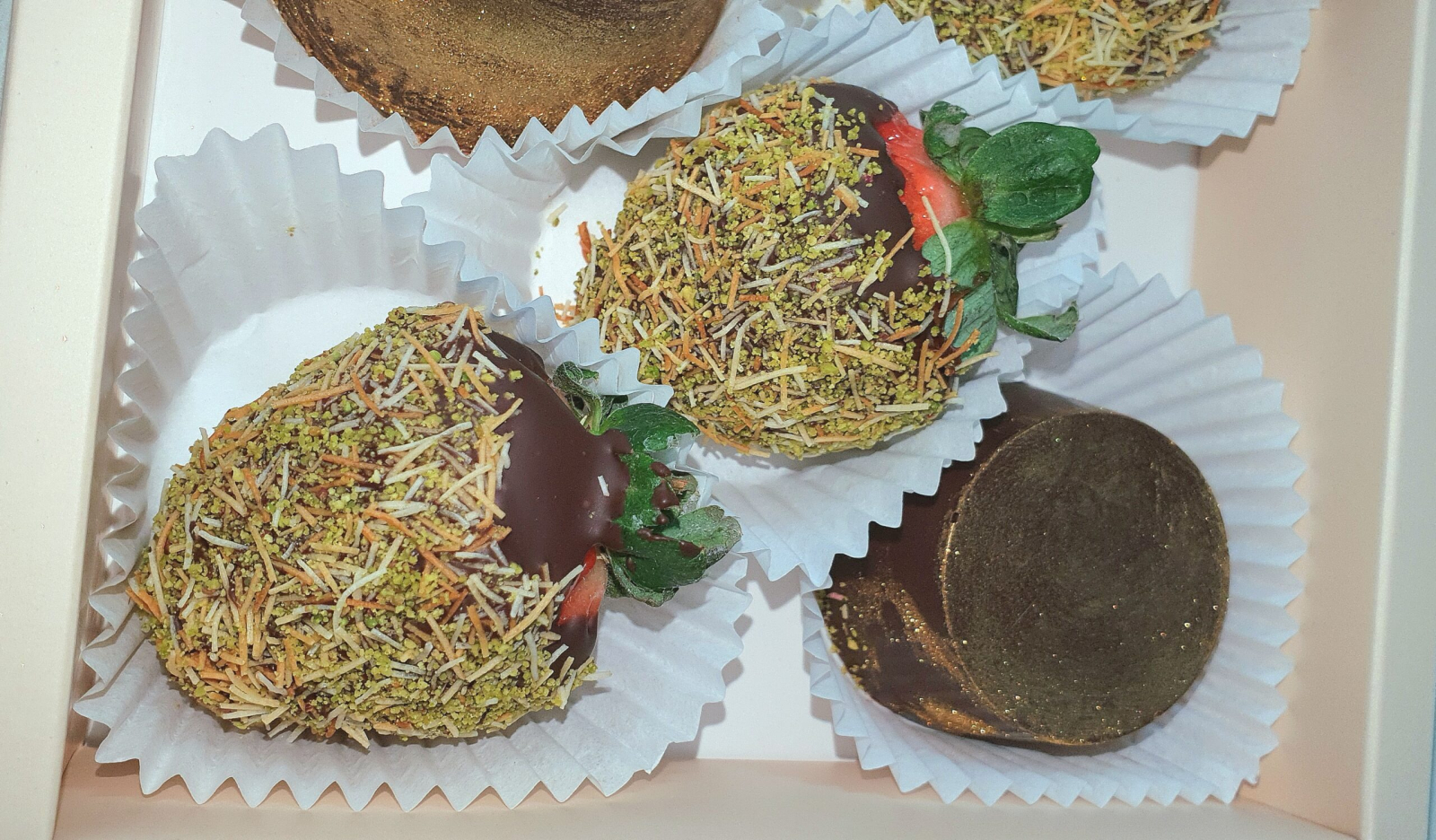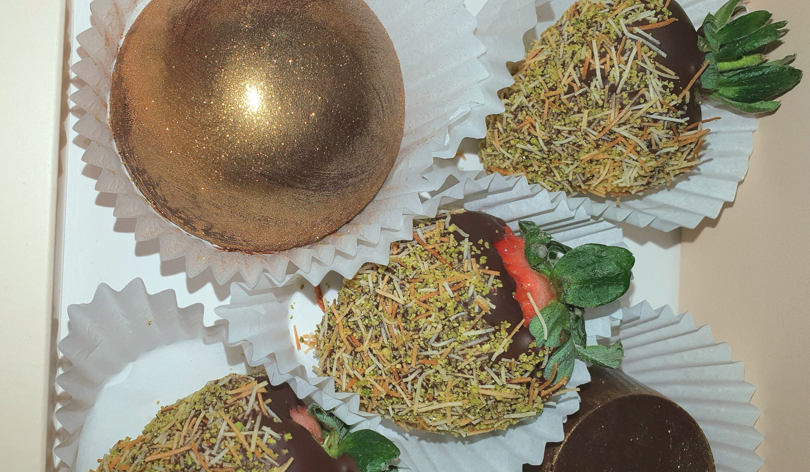 Descriere: Această cutie premium redefinește eleganța culinară, îmbinând căpșuni proaspete cu ciocolată fină, cataif crocant și fistic. Înnobilate cu accente aurii spectaculoase, aceste delicii oferă o experiență gustativă unică și luxoasă, perfectă pentru momente de neuitat.