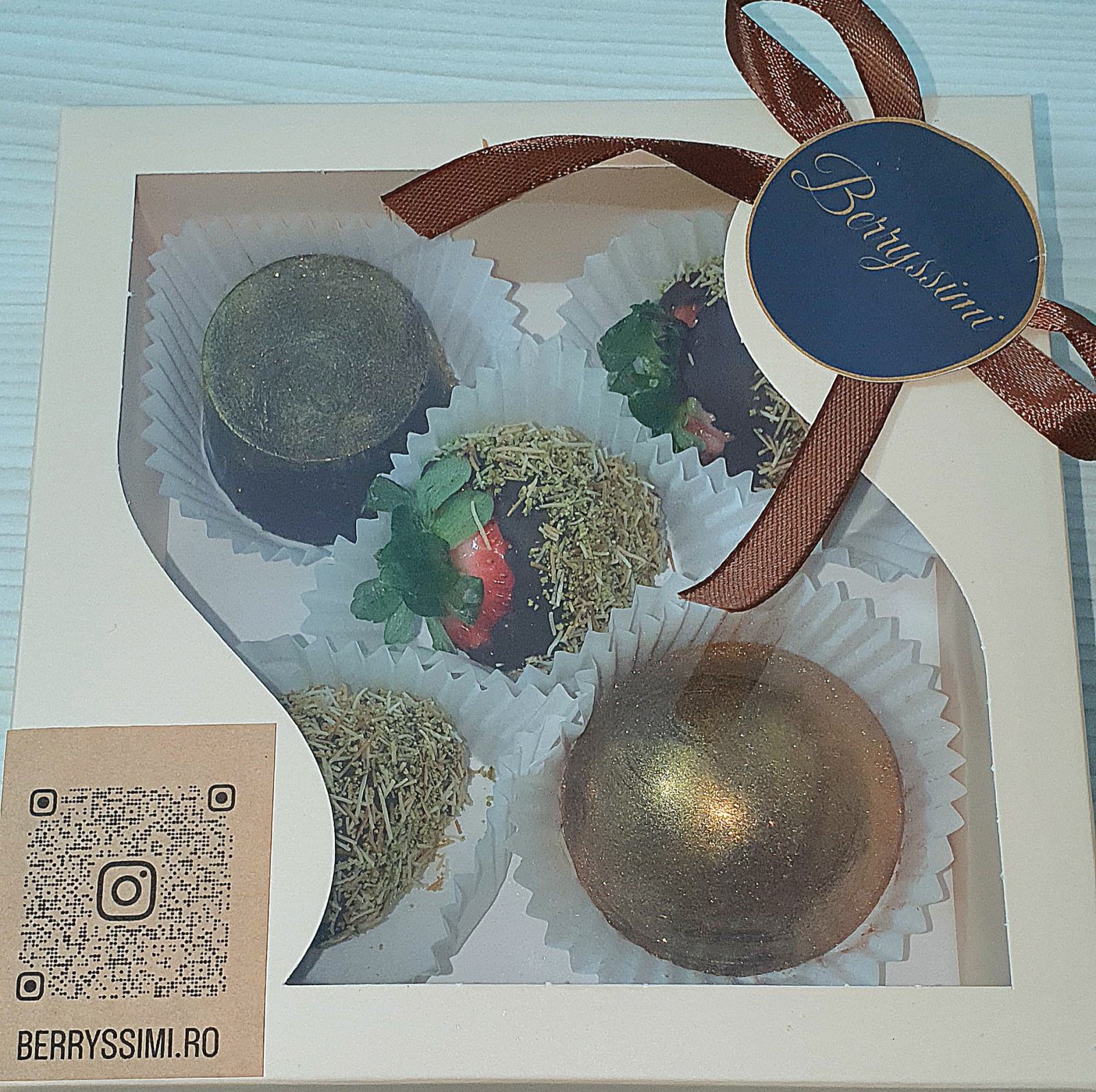 Ingrediente: căpșuni, ciocolată cu lapte, ciocolată neagră, ciocolată albă, fistic, cataif.