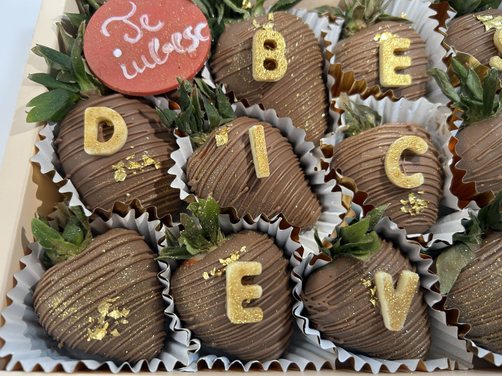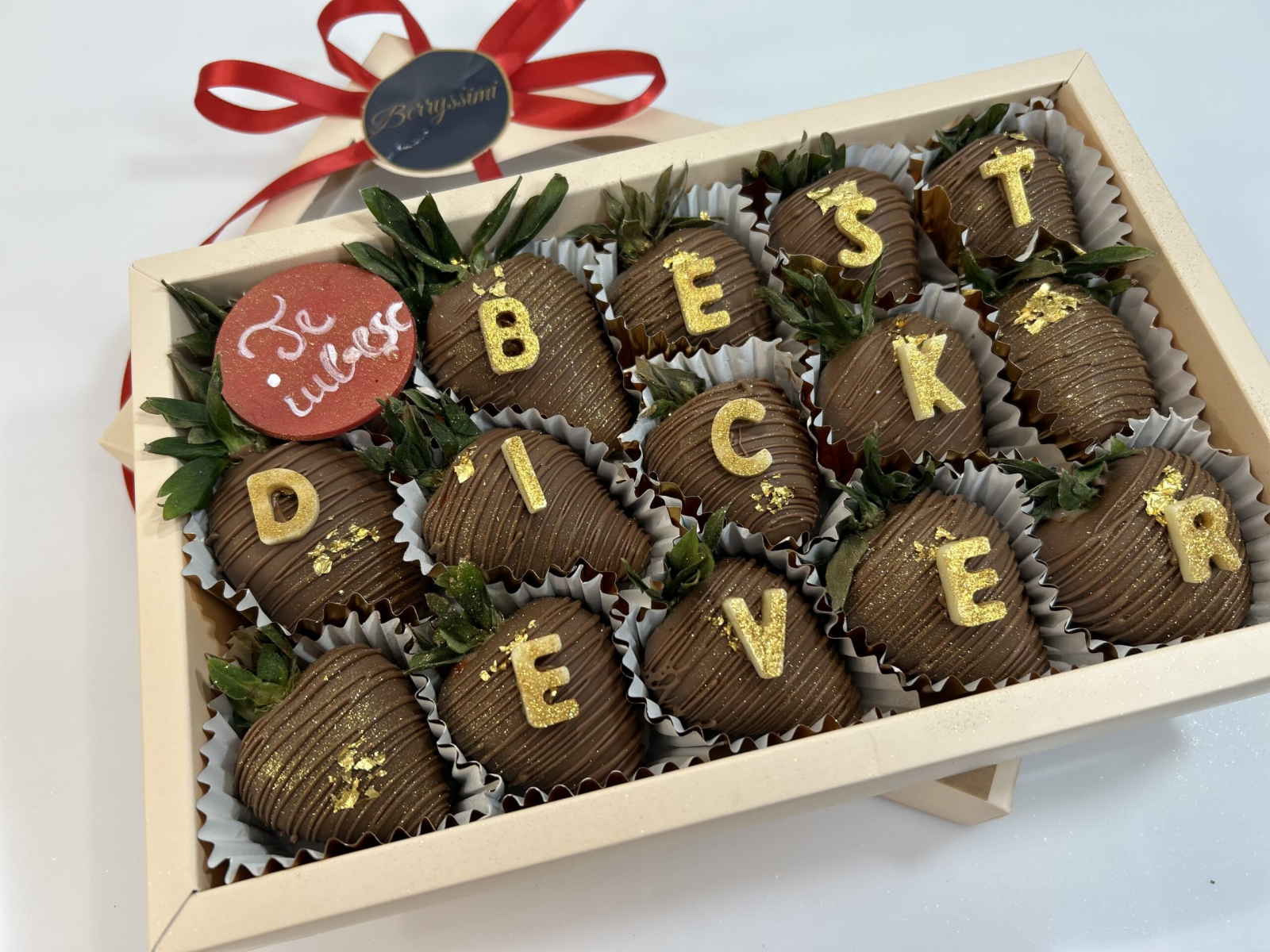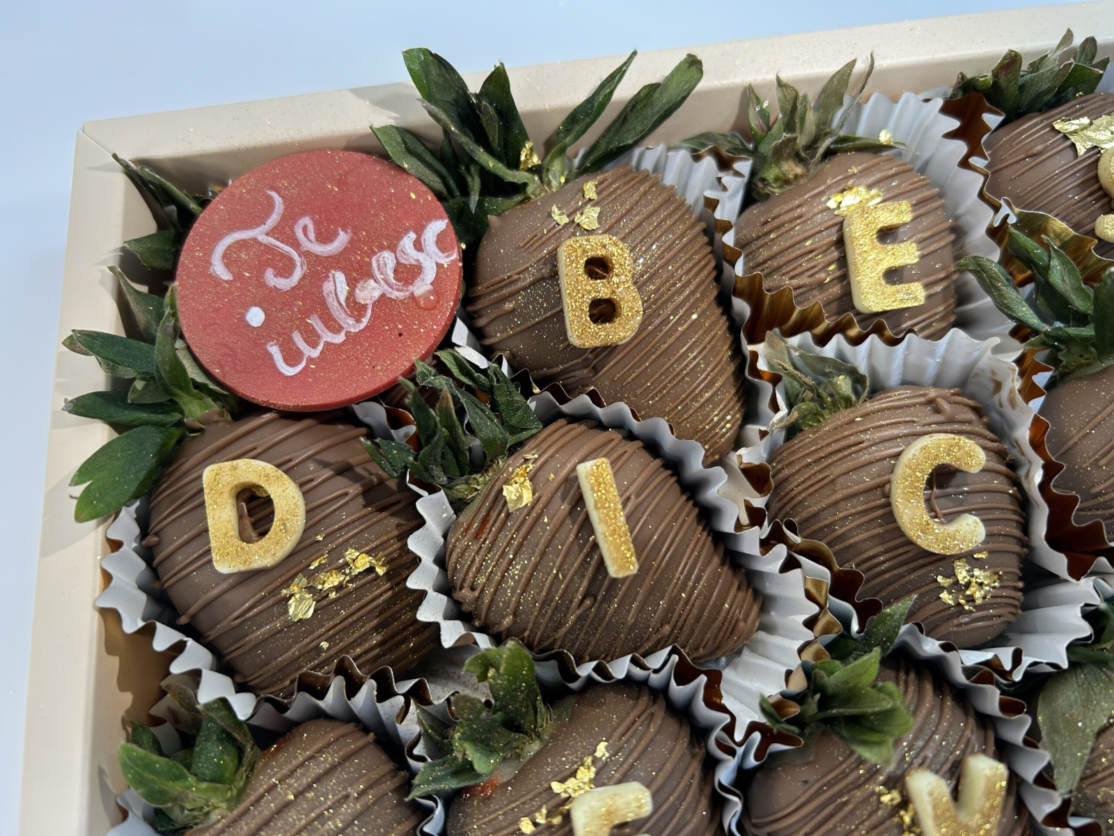Descriere: Această cutie unică și amuzantă conține căpșuni proaspete acoperite cu ciocolată fină și decorate cu litere aurii care formează mesaje jucăușe. Este combinația perfectă de dulce și surpriză, ideală pentru a aduce un zâmbet pe buze la orice ocazie specială.