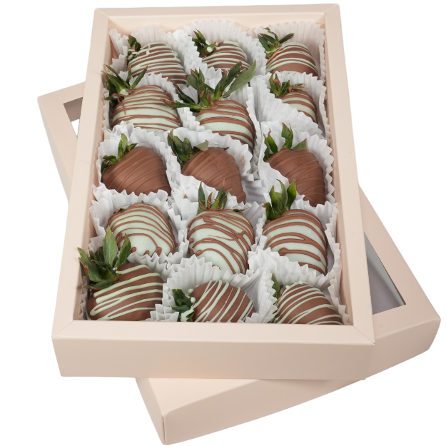 Ingrediente: căpșuni organice, ciocolată cu lapte, ciocolată lemon.