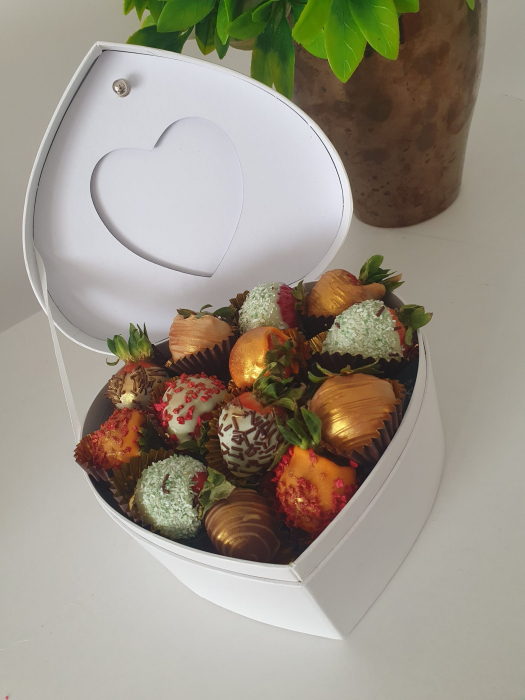 Ingrediente: căpșuni, ciocolată cu lapte, ciocolată Lemon, ciocolată Orange, zmeură liofilizată, portocală liofilizată, fulgi de cocos, bastonașe de ciocolată neagră, pulbere de aur.