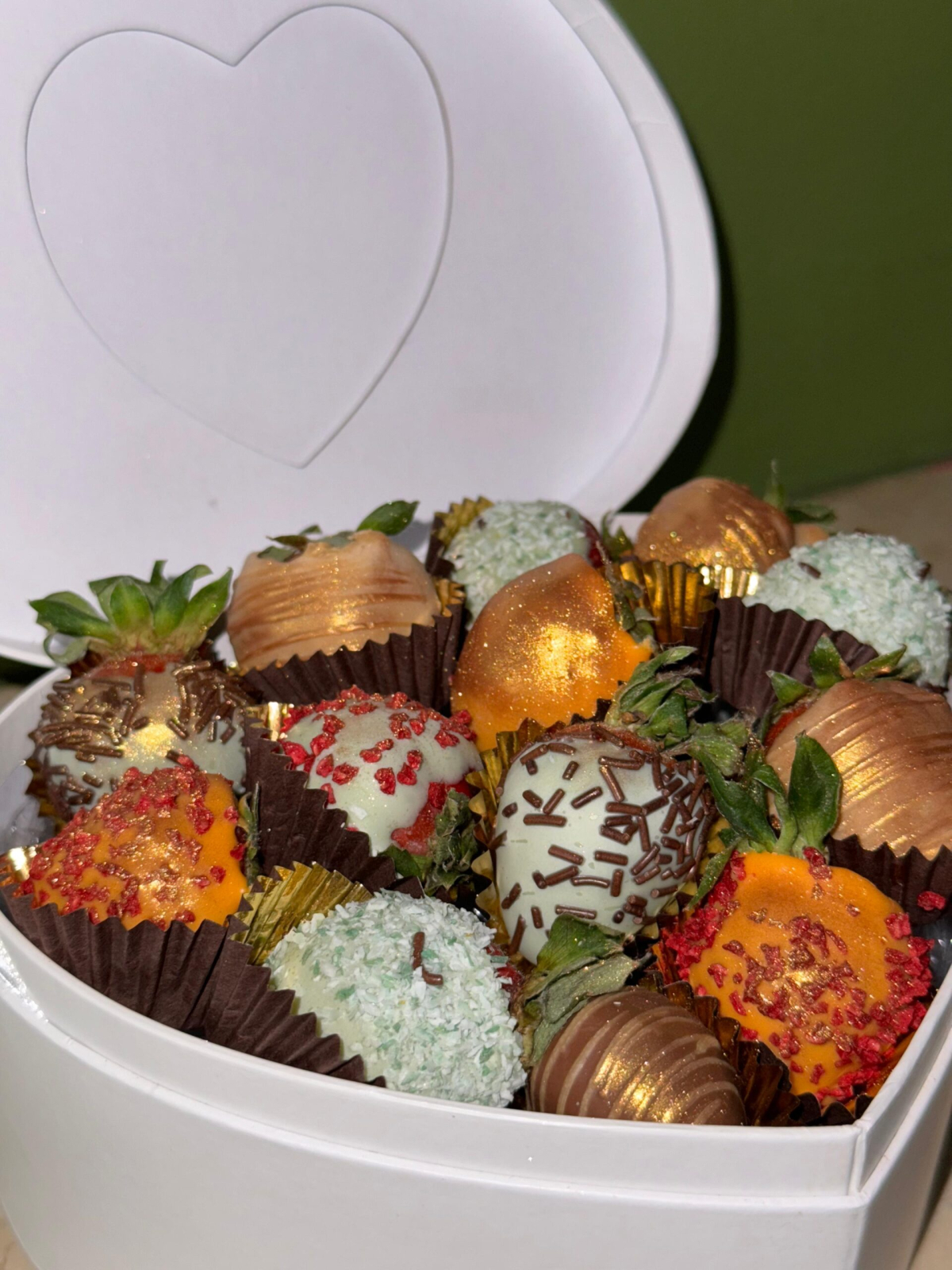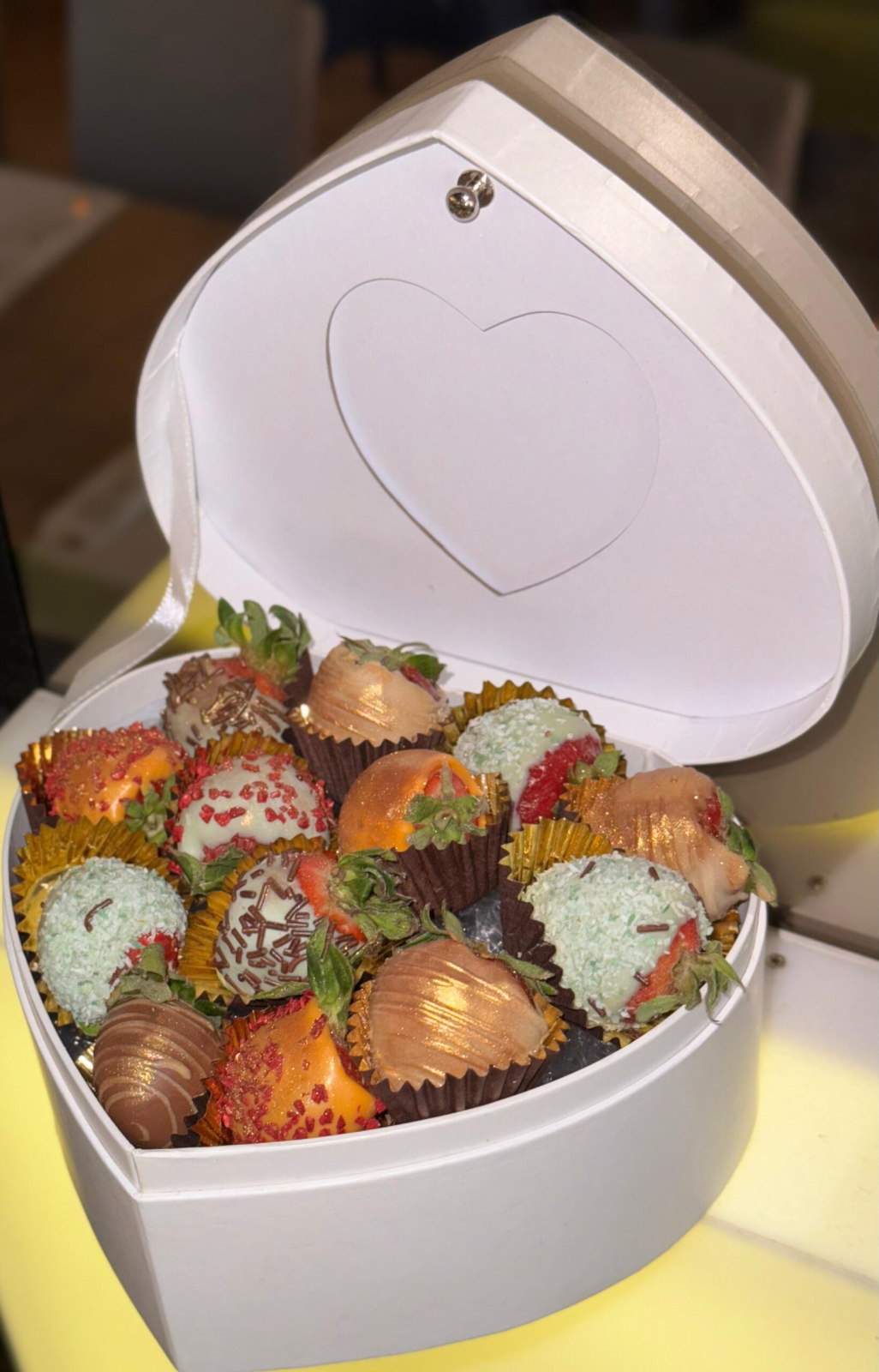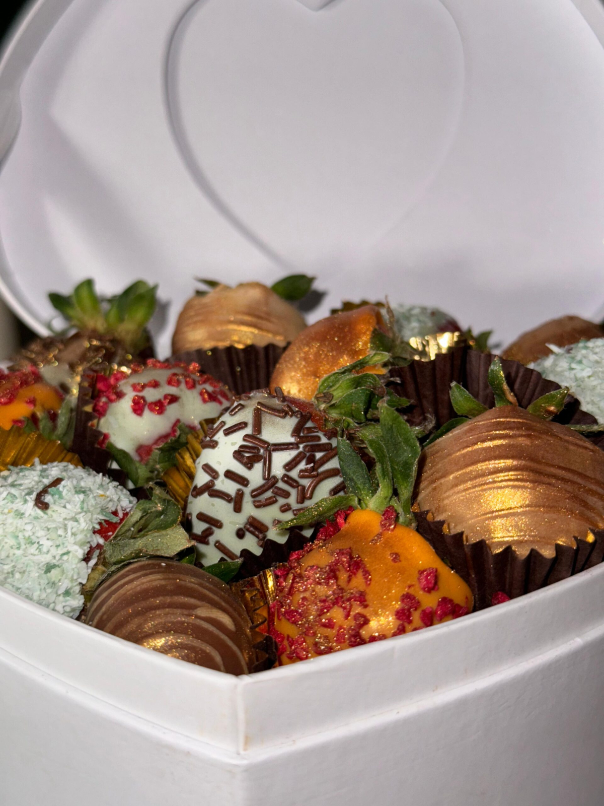 Descriere: Oferă un cadou delicat și special celor mai importante persoane din viața ta cu această cutie deosebită de căpșuni în ciocolată, zmeură liofilizată și fulgi de cocos. Decorate cu bastonașe de ciocolată neagră și pulbere de aur, aceste delicii sunt gestul perfect de afecțiune și rafinament.