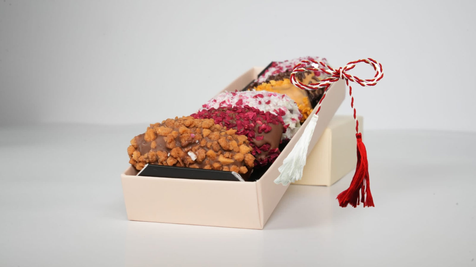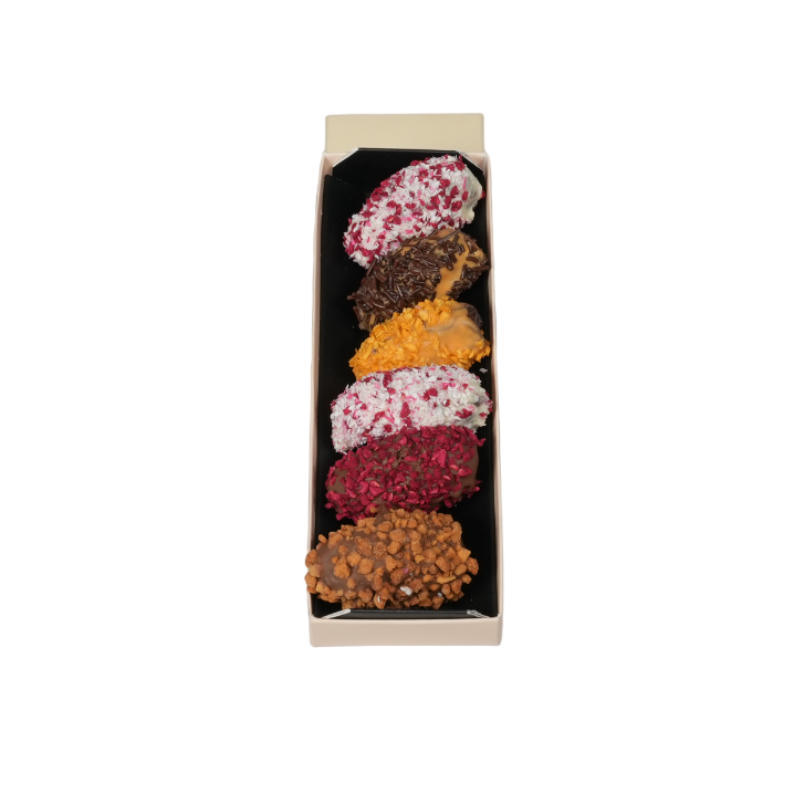 Ingrediente: curmale, ciocolată cu lapte, ciocolată albă, ciocolată cu portocale, zmeură și portocală liofilizată, nucă de cocos, bețișoare de ciocolată neagră.