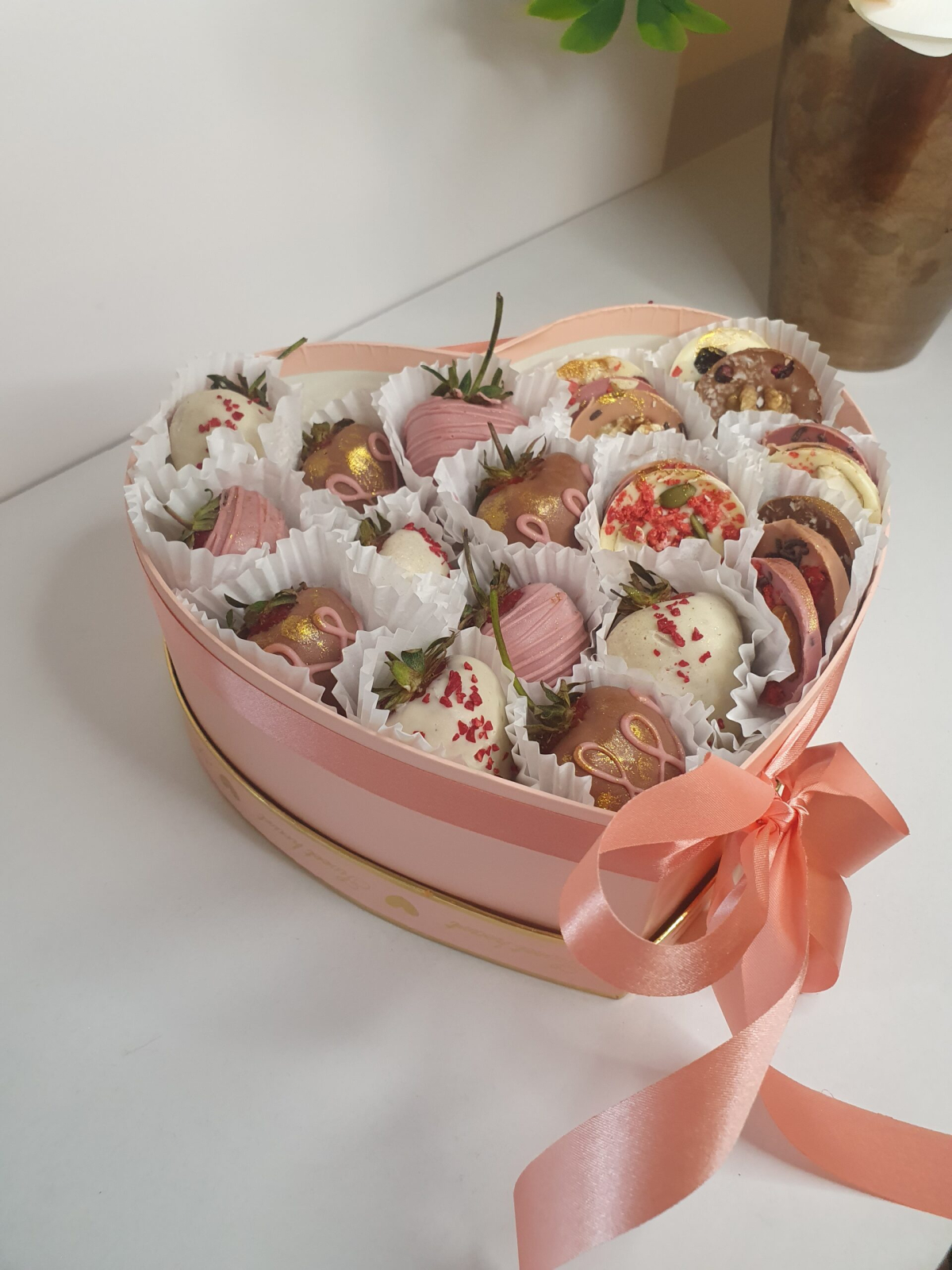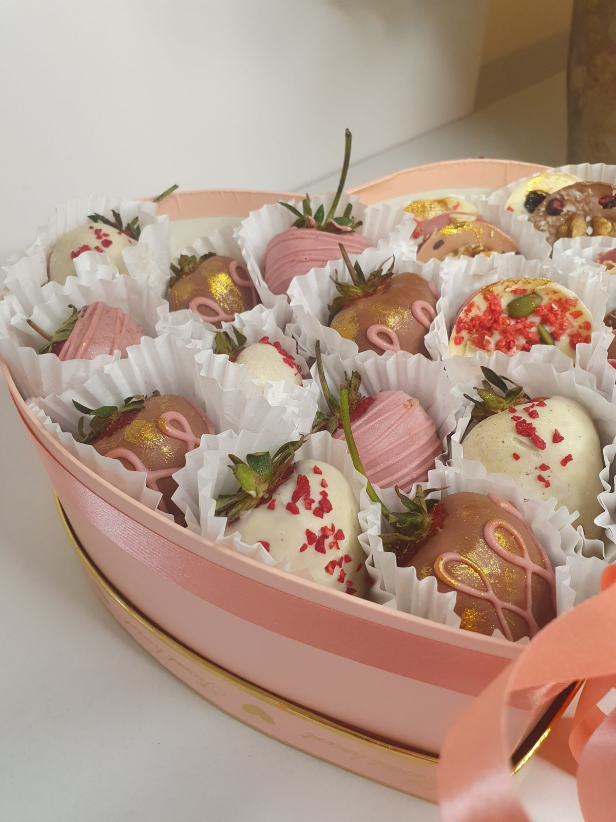 Descriere: Colecția Pink Heart îmbină delicatețea căpșunilor proaspete cu finețea ciocolatei roz și accente aurii, creând un desert irezistibil. Decorate cu mini-tablete de ciocolată, nuci și cocos, aceste mici opere de artă sunt cadoul perfect pentru a aduce zâmbete și momente de bucurie celor dragi.