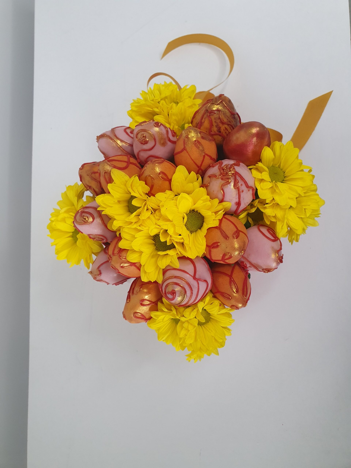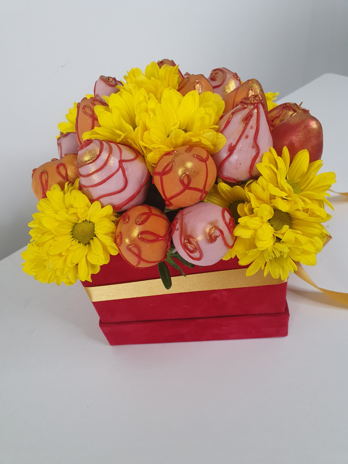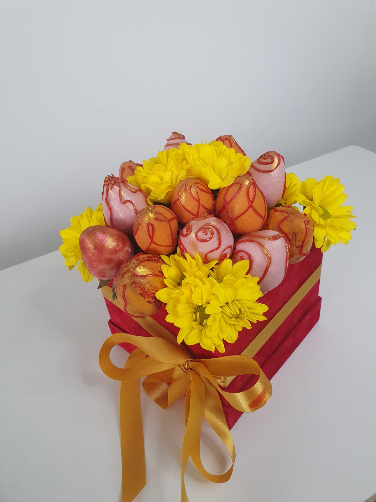 Ingrediente: căpșuni proaspete organice, ciocolată Orange, Lemon, Ruby, pulbere de aur.