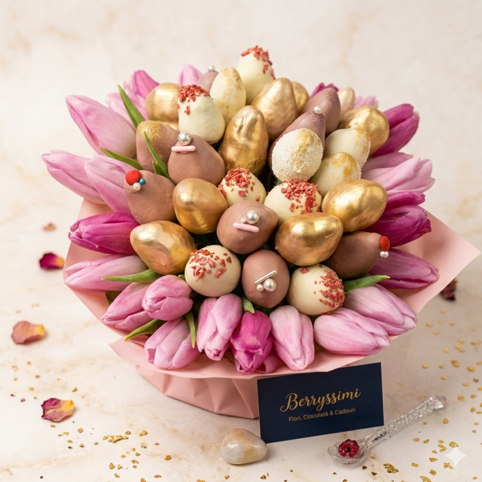 Răsfăț regal într-un buchet memorabil. Îmbină eleganța clasică a lalelelor roz cu savoarea irezistibilă a căpșunilor premium, decorate manual în nuanțe luxoase de rose-gold, sidef și accente metalice. Golden Tulip Charm nu este doar un cadou, ci o experiență senzorială completă, creată pentru a impresiona prin estetică și gust. Perfect pentru aniversări, gesturi romantice sau pur și simplu pentru a aduce un zâmbet strălucitor cuiva drag.