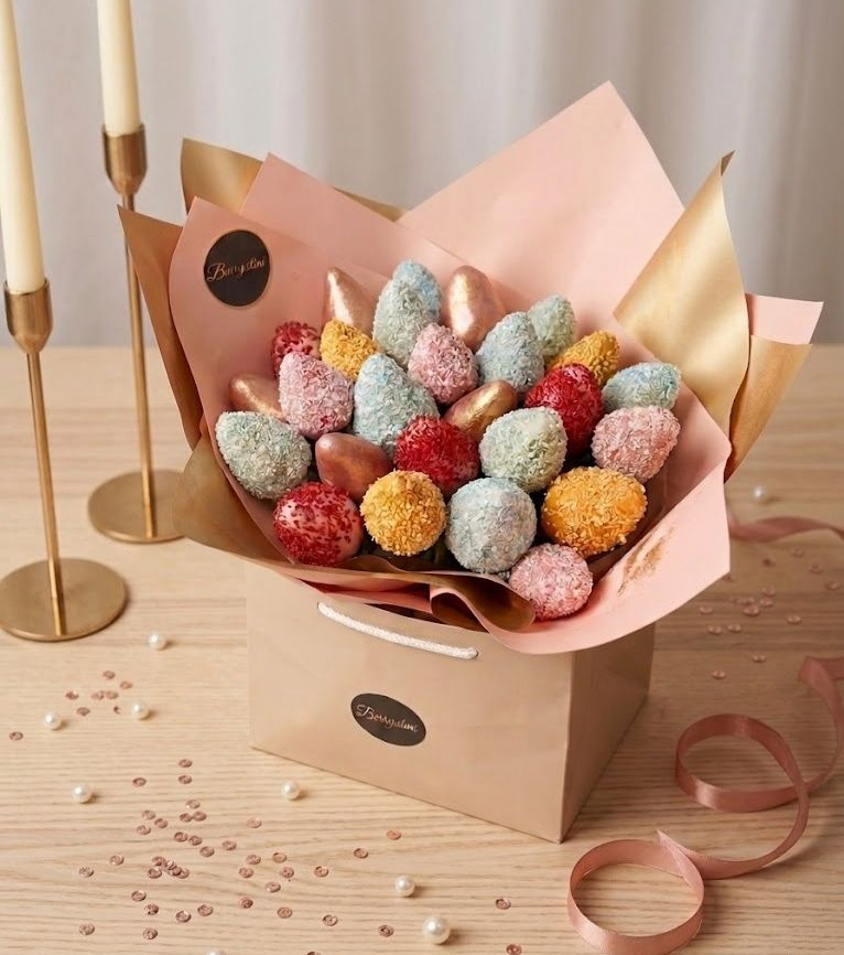 Descriere: Această simfonie a răsfățului îmbină rafinamentul florilor cu dulceața căpșunilor organice, glazurate în nuanțe pastelate și decorate cu accente aurii regale. O explozie de culoare și gust, acest buchet transformă desertul clasic într-o experiență de neuitat, ideală pentru a impresiona și a răsfăța simțurile la orice ocazie specială.